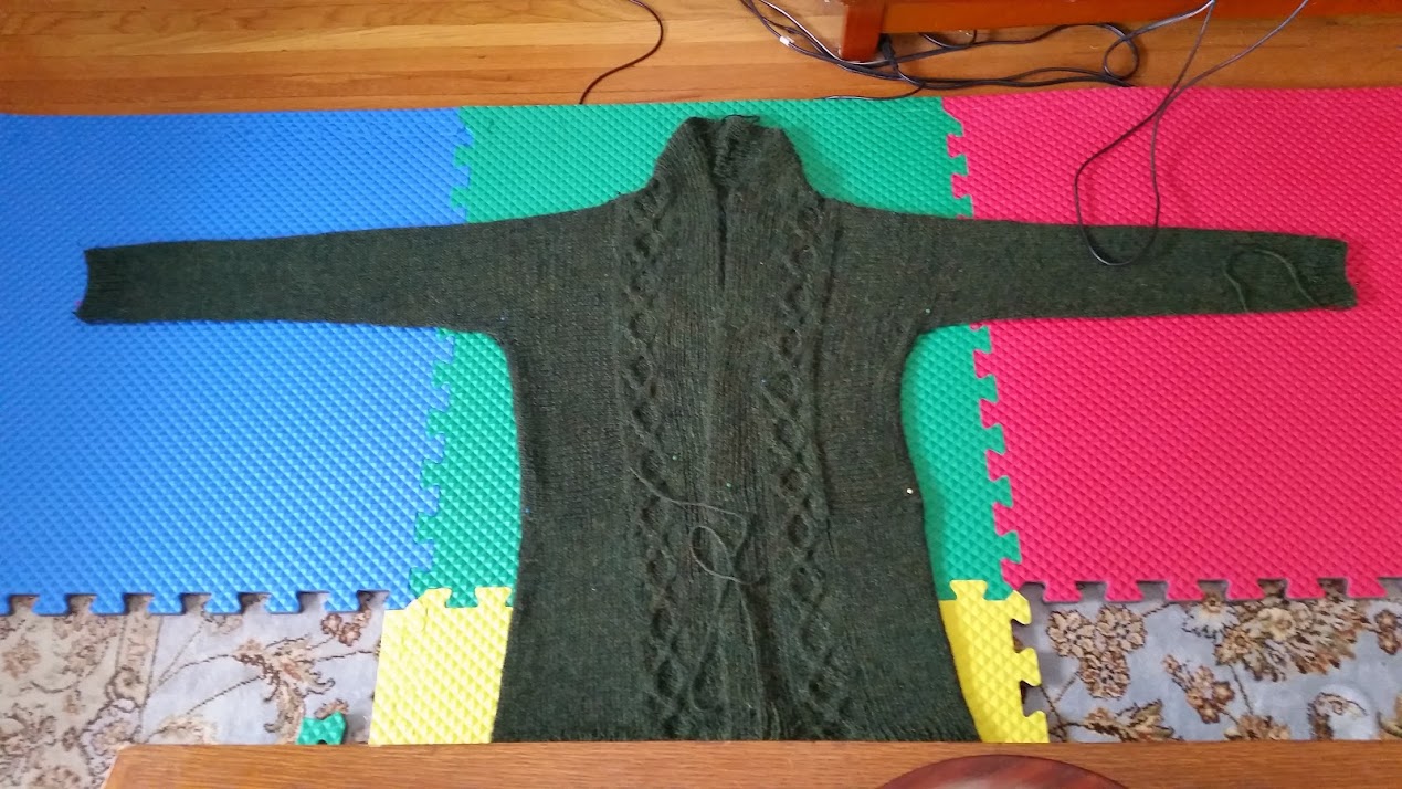 tea/coffee sweater. It finished blocking on Sunday morning and I’ve worn it
